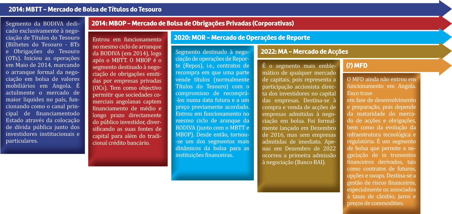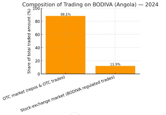 No caso de Angola, a BODIVA começou a ganhar tração mais forte a partir de 2022, com as primeiras operações de acções (OPI’s), sendo que o rank das operações de mercado permanece dominado pelos Títulos do Tesouro e operações OTC4 (Over-the-Counter). Estudos e notícias especializadas apontam que a maior parte do volume negociado em 2024, continuou a ser feito no mercado OTC (cerca de 88% do total negociado), e apenas uma ínfima fracção nos mercados regulamentados da BODIVA, o que traduz baixa liquidez do mercado de acções e ainda poucas empresas listadas.