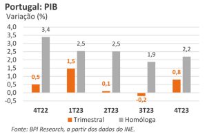 A economia portuguesa cresceu 2,3% em 2023, e apenas foi superada pela economia espanhola. Este crescimento, no entanto, compara com os 6,8% de melhoria do PIB em 2022, muito embora aquele tivesse sido o ano pós-Covid e com expansão da economia em toda a linha. Aliás, os analistas preferem fazer comparativos de atividades económicas com o ano de 2019, aquele em que não houve impacto da pandemia mundial.