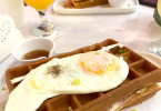 O menu faz jus ao nome do espaço: há, como é óbvio, uma variedade saudável de crepes doces e salgados, mas o Crepe Ville vai para além disso. É também possível encontrar waffles, sanduíches, massas e omeletes. Infelizmente, na última vez que lá fomos, um dos nossos preferidos, o Yummi de quatro sabores (queijo, carne moída, bacon, topping creme de pomodoro e salada) estava indisponível, e por isso experimentamos o Bonjour Waffle (ovo, bacon fiambre, chourição queijo e creme especial). A comida vem com um aspecto agradável, e a massa é muito leve; achamos a combinação de sabores aprazível.