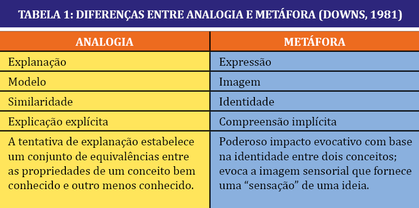 Enquanto a analogia se utiliza de modelos em busca da explanação, a metáfora gera imagens para a expressão (tabela 1).
