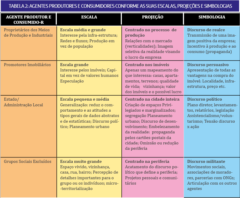 A tabela 2 sintetiza o comportamento de cada grupo conforme a escala, projecção e simbologia. Cada agente produtor e consumidor desenvolve as suas estratégias conforme a escala, a projeção da realidade e da simbologia, o que se reflete em visões do espaço diferentes e muitas vezes não (re)conciliáveis. Enquanto o poder político (Estado, Administração Local…) possui uma ideia mais generalizada do espaço (uma geografia sem agentes sociais) sem se preocupar com as necessidades individuais da população, os moradores de bairros degradados e de génese ilegal prendem-se nos detalhes sem compreender os sofisticados mecanismos da estrutura política. Industriais e promotores imobiliários centram a sua visão do espaço na produção e na venda (visando o lucro). O Estado e a administração local, por sua vez, insistem num conceito de cidade mais generalizado para justificar o planeamento urbano e procuram enfatizar os “cartões-postais” da cidade, escondendo ou omitindo os problemas dos bairros degradados e/ou ilegais cuja imagem é “homogeneizada”. Neste enredo de escalas e projecções, os movimentos sociais tentam criar uma “consciência dos marginalizados” pela sua posição periférica para fazer reivindicações junto ao poder público. A linguagem utilizada de cada agente manifesta-se nos seus discursos sobre o espaço que reflete os interesses políticos, económicos e sociais de cada um.